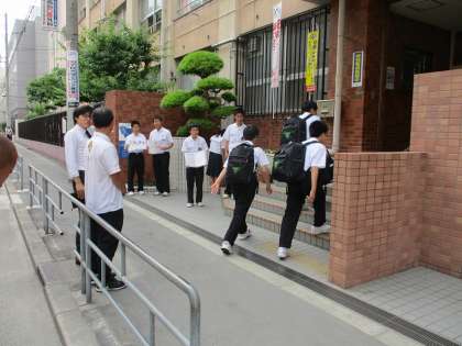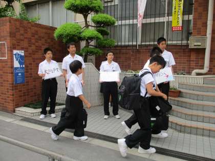 毎週月曜日は、8:20から全校集会があります。登校時に正門前で、プラカードを持った生徒会の生徒が、さわやかに挨拶して声掛けしています。