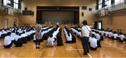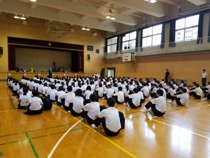 6月4日(火)3年生は、6時30分に体育館に集合し、出発式を行いました。学級代表の合図で、集合整列しました。校長先生の話から、生徒代表の挨拶、添乗員さん・写真屋さん・看護師さんの紹介があり、健康チェックをして終わりました。