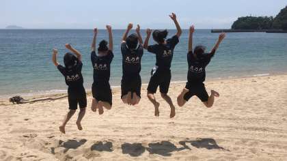 砂浜でみんなでジャンプ。周防大島の活動も残り少しで終わりです。