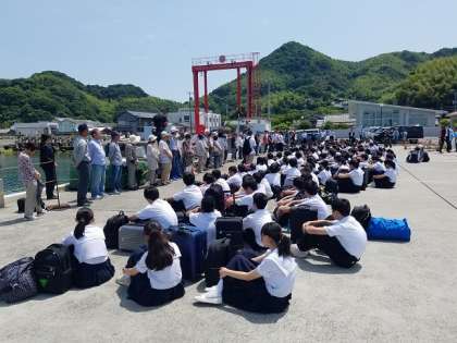 民泊の活動も終わり、港で離島式です。学年の代表が挨拶しています。
