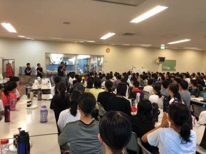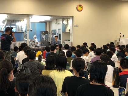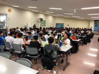 現地が雨天のためプログラムを変更し、入浴を先に済ませて、生徒代表の「いただきます」で昼食になりました。本日のカヌー・カヤック体験は明日に延期になりました。