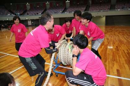 綱引きの決勝が終わり、勝利した教員チームが、気持ちよく笑顔で後片付けです。