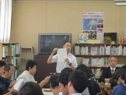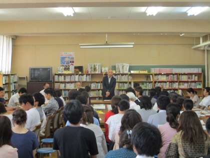 第1部全体会は、花乃井中・西船場小・明治小・本田小の教員全員が図書室に集合して行われました。
