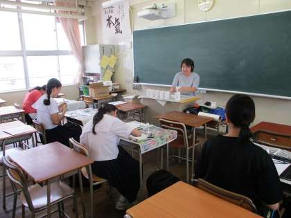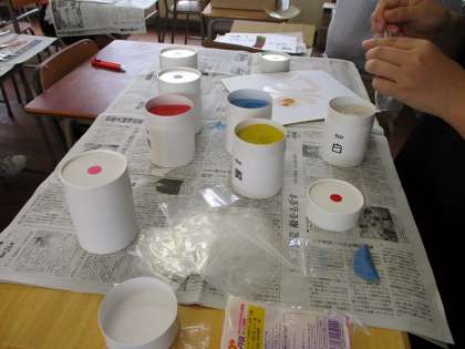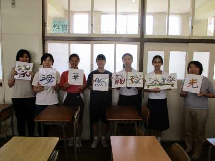 夏休みに入りましたが、花乃井中学校では毎日チャレンジ講座を開講しています。7月25日(木)に実施された「砂字」の講座を紹介します。2日間で約4時間の講義です。1日目に習字で文字をデザインし、2日目で切り取った文字を色紙の台紙に貼り付け、最後は色砂を使って作品を作ります。完成した砂字の作品を持ち記念撮影し、講座は終了しました。