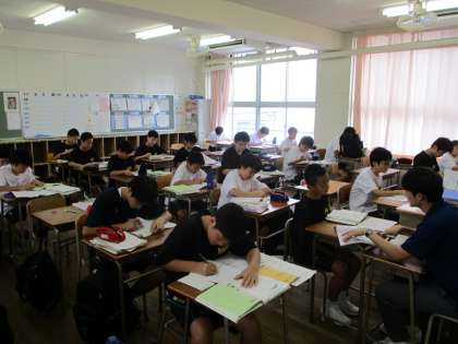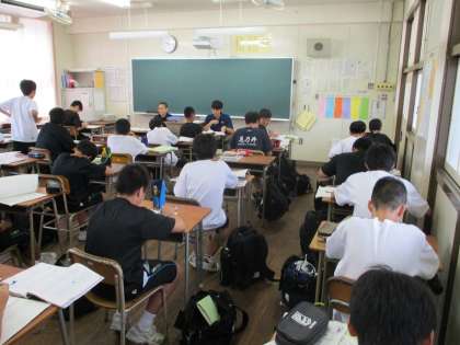 8月19日(月)部活動前に、男子バスケットボール部の1〜3年生は、3年の教室で宿題チェックを行いました。夏休みも今週で終わり、いよいよ来週から2学期がスタートします。夏休み中の宿題が全部終わっているか、部活動顧問がチェックし、まだできていない宿題は空調が入った教室で勉強します。多くの部活動で、同じように宿題のチェックが行われています。