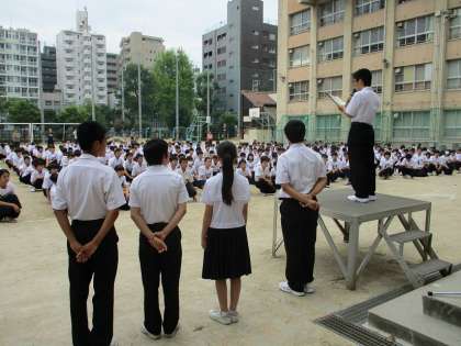同じく全校集会の部活動表彰です。写真上から2枚は水泳部、写真下は生徒会です。水泳部は、団体と個人で入賞しています。表彰後は、生徒会より今週の連絡があり、第1回の全校集会は終わりました。
