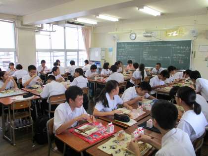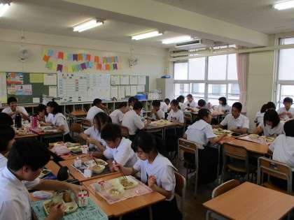 8月27日(火)から給食がスタートしました。今日のメニューは「和風焼きそば(かつお節付き)、きゅうりのゆず風味、パン(1/2)、牛乳」です。3年生の教室では、夏休み中の話題を中心に、会話がはずんでいました。