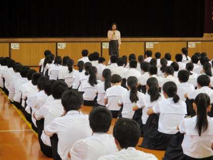 8月28日(水)3年生は、体育館で学年集会を行いました。3年担任の先生より、夏休みの振り返りの後、「皆さんは、幸せに生きるためのお道具箱を持っています。」「できるだけたくさんの道具を詰めていくことによって、夢は実現させることができます。」勉強する意味とは何か?「道具を磨いて、いつでも使えるようにすることが、とても大切です。」2学期のスタートの学年集会で、学年を代表して、熱い思いを話しました。そして最後に、担当者から奨学金の話があり、学年集会は終わりました。