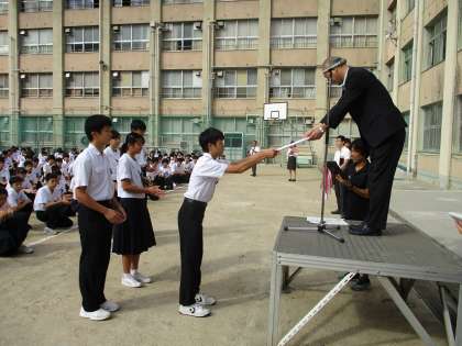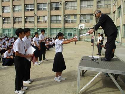 同じく全校集会の部活動表彰です。写真上2枚は、陸上競技部男子団体、写真下は同じ陸上競技部女子団体です。陸上競技部は、団体以外にも個人で多数入賞しています。