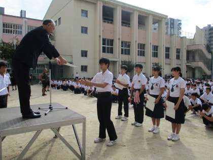 同じく全校集会の部活動表彰です。陸上競技部の顧問より、個人の入賞が紹介され、女子個人の部と男子個人の部の代表生徒が、校長先生より表彰状を受け取りました。