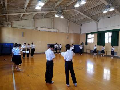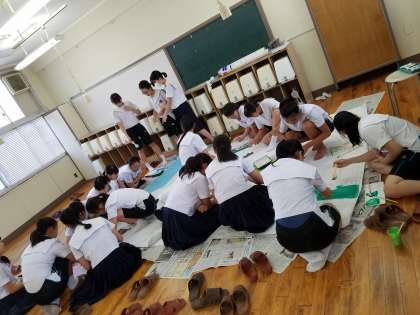 9月3日(火)5・6限の総合の時間に、3年生は各クラスや各担当ごとに、文化祭の取り組みを行いました。被服室では、みんなで協力して舞台背景の作成です。格技室では、舞台発表の練習で、劇の台本の読み合わせが始まりました。