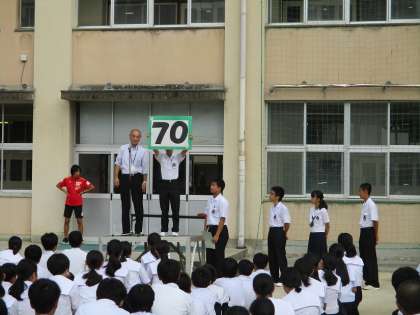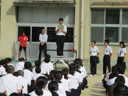 9月9日(月)表彰式後の校長講話では「花乃井中学校は創立70周年を迎え、今年で71年目です。伝統があり、多くの卒業生が巣立っています。」「あみだ池筋側のフェンスには、70周年のスローガンが掲示されています。横断幕には『過去には感謝を、現在には信頼を、未来には希望を』と書かれています。生徒会の人たちを中心に決めました。」「花乃井中学校を担う、いろいろな世界で活躍している伝統は、脈々と受け継がれています。」「今週一週間、しっかり頑張っていきましょう!」と締めくくられました。校長講話の後、生徒会より今週の連絡があり、全校集会は終わりました。