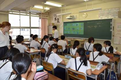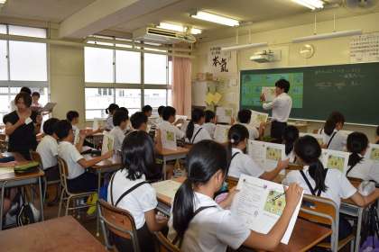 2年4組の教室で、英語科の授業です。「道案内をしよう!」と題して、東京オリンピックマスターになって、道案内をしようです。