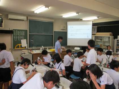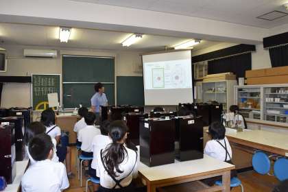 理科室で、理科の授業です。「梨のシャリシャリの謎」では、初めに細胞のつくりを学びました。そして顕微鏡のを使い方の手順について説明を聞いた後、梨のシャリシャリの理由である「石細胞」を観察しました。