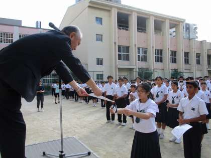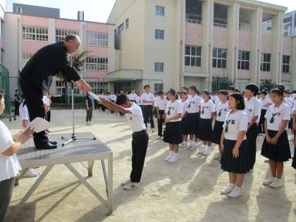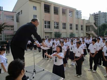 9月17日(火)運動場で全校集会を行いました。表彰式では、9月7日(土)咲くやこの花中学校で行われた「第15回ワールドトーク(多文化スピーチ大会)」に出場し、修学旅行や将来の夢について発表した3人が表彰されました。