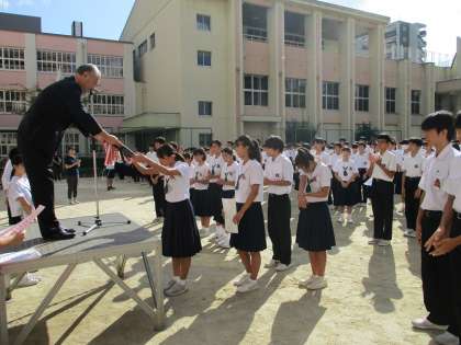 同じく表彰式で、水泳部の女子団体(優勝)と男子団体(第2位)、また男女個人で、多数の入賞があり、代表生徒が表彰状と盾を受け取りました。