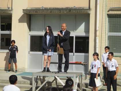 9月17日(火)表彰式後の校長講話では、本校生徒宅にホームステイしているオーストラリアからの留学生の紹介がありました。「留学生は国際交流の一環で、今日を合わせて3日間、中学校生活を過ごします。」「今週から文化祭週間が始まります。文化祭も大切な行事ですが、日ごろの学校生活をしっかり頑張ってください。」「今週一週間、ともに頑張りましょう!」と締めくくられました。校長講話の後は、生徒会より今週の連絡があり、全校集会は終わりました。