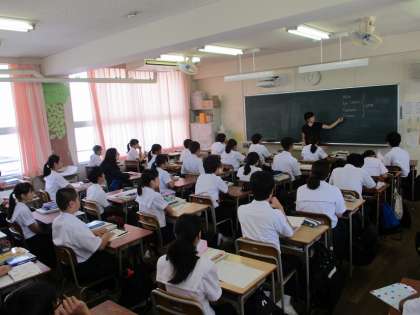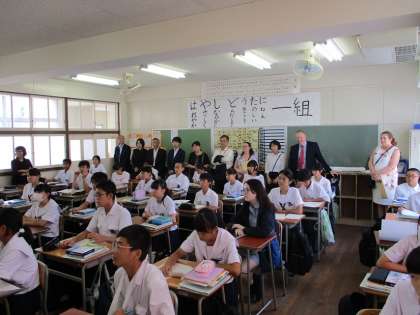 9月17日(火)本校生徒宅に、オーストラリアからの留学生がホームステイしています。彼女の在籍校「モーニングトン中等学校」より、校長先生をはじめとする先生方と大阪市PTA協議会の皆さまが来校されました。校長室で、英語と日本語を交えながら歓談した後、2年生の英語の授業を見学されました。留学生は約2週間、日本に滞在し、花乃井中学校には、9月24日(火)と25日(水)に登校して、中学校で過ごします。