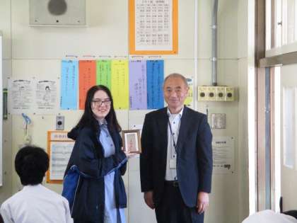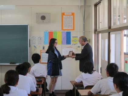 9月25日(水)、オーストラリアからの留学生の体験入学の最終日でした。2年1組の授業の初めに、校長先生から「見返り美人」の絵が入ったかわいい額縁が贈呈されました。教室内では拍手が起こりました。花乃井中学校での3日間は、とても明るい雰囲気に包まれた体験入学で過ごすことがでたと思います。留学生は残り2日間、日本に滞在し、大阪観光で過ごします。