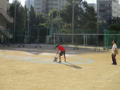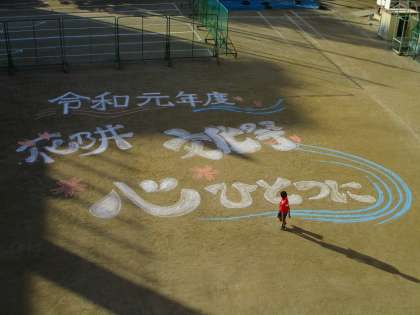 9月26日(木)は第69回文化祭1日目です。生徒の皆さんが登校する前に、運動場ではサンドアート(砂絵)の仕上げがありました。4階廊下から見るのが一番です。9時前には体育館で開会式が始まります。