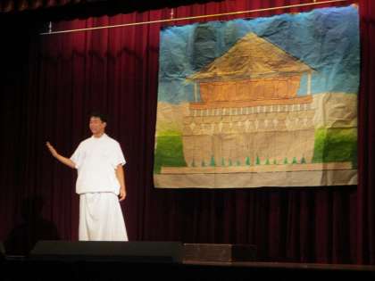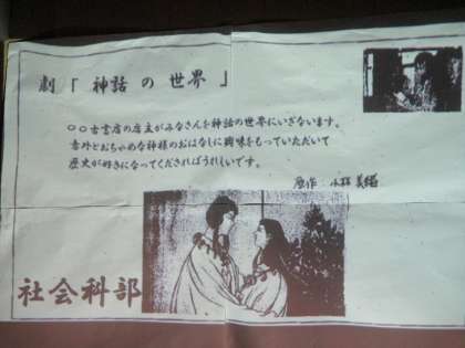CT発表の次は部活動の発表です。社会科部は「むかーし、むかしの神様のおはなし」で、日本最古の歴史書を劇にして発表しました。古書店の店主が、神話を紹介することで舞台は進行しました。この発表をきっかけに、歴史に興味を持って好きになっていただければ嬉しいです。