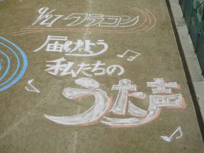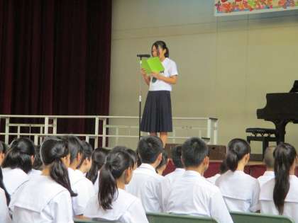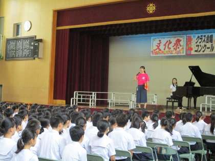 9月27日(金)文化祭2日目の午前は、クラス合唱コンクール(クラコン)です。開会式で、音楽の先生が全体発声でいつも授業でやっているように「まままままままままー」「まめみむめもまみまー」と練習しました。そして文化祭実行委員会の3年副委員長より、審査基準と諸注意があり、クラコンはスタートしました。司会進行は2日目も生徒会が担当します。