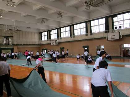 9月27日(金)文化祭2日目の昼食後、クラス合唱コンクールが終わったので、2年生が体育館の片づけを行いました。張り出し舞台を片付け、イスも舞台下に入れ、シート上を掃除してから、たたんで片づけました。その後はモップがけして、体育館の片づけは終了です。1年と3年はこの時間帯に、展示発表見学中。最後は全校生徒が体育館にもう一度集合して閉会式があります。