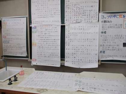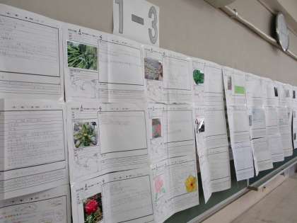 理科の展示発表は、1年の調べ学習「身近な植物を調べよう」と理科部の活動発表です。理科部は、4月から今までに行った実験の結果と考察(写真下)、作品の展示発表をしました。