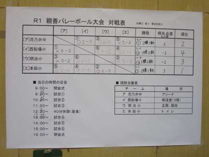 花乃井中学校PTAバレーボールチームの皆さん、お疲れ様でした。また、朝早くの準備から最後の片づけまでしていただいた、PTA役員会・保健体育委員会の皆さんありがとうございました。