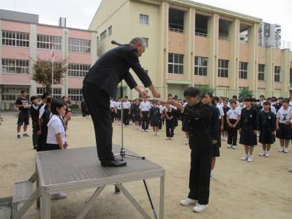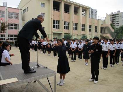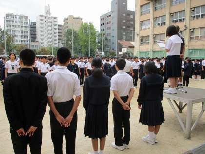 10月21日(月)後期生徒会役員の集合整列司会で全校集会が始まり、初めに表彰を行いました。先日行われた「大阪市立中学校総合文化祭」展示発表の部(美術の部)において、大阪市立美術館に作品展示をしましたので、3年生と2年生が代表して賞状を受け取りました。
