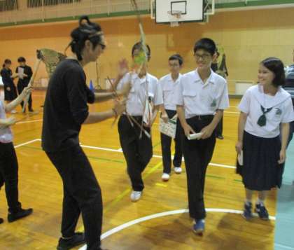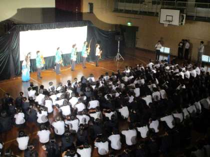 芸術鑑賞会の後半の第2部(2年・1年4〜6組)も終了しました。第1部と同様に生徒会役員よりお礼の言葉がありました。そして最後は、劇団影法師の皆さんから「サイチェン」(再見)と挨拶があり、本日のプログラムは終了しました。教室に戻る時に、スタッフの皆さんが、皮影戯を持って、体育館内で見送っていただきました。劇団影法師の皆様どうもありがとうございました。