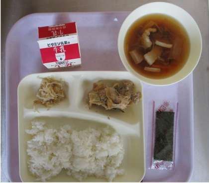 沖縄料理には、豚肉や海そう、豆腐、沖縄特有の野菜が使われた料理がたくさんあります。ソーキ汁もその一つで、ソーキ(豚の骨つきあばら肉)と島だいこん、昆布をかつおだしで煮込んだ汁ものです。給食のソーキ汁は、豚ばら肉・だいこん・切りこんぶ・にんじん・白ねぎなどを使っています。
