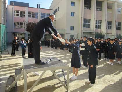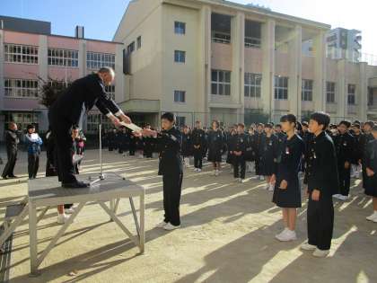 11月5日(火)全校集会で部活動の表彰を行いました。男子バスケットボール部個人(1年生)と先日行われた「大阪市立中学校総合文化祭」展示発表の部(社会の展示の部)において、大阪市立鶴見区民センターにて、キャッシュレスに関する内容を展示発表しましたので、それぞれ賞状を受け取りました。