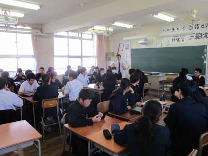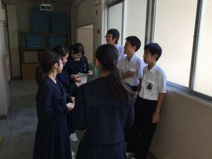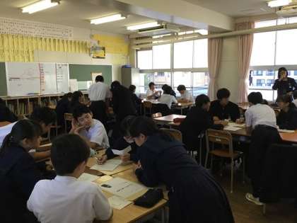11月5日(火)5限目のCT「絆」の取り組みで、2年生は班で協力して、事件を解決する活動をしました。来週の「校外学習」を前に、後期の班単位で活動、事件を解決する中で、情報収集して話し合いをすることで「仲間づくり」をしました。