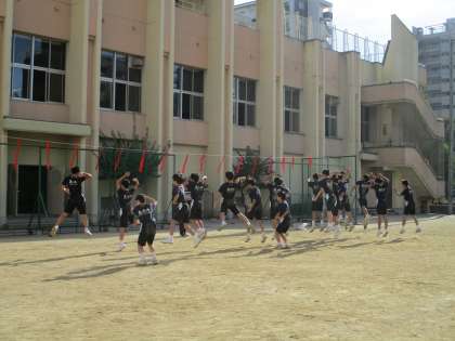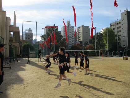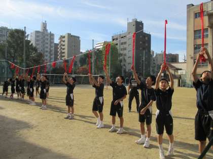 11月7日(木)1限目の2年保健体育科の授業の様子です。今日はバレーボールの練習です。高く跳べるジャンプの説明を聞いた後は、ロープに吊られた「赤いたすき」に向かって、アタックの練習をしました。途中で結び目を作って高さの調整もしました。そしてトス、サーブの練習をし、最終的には試合ができるように、基礎基本を学びました。
