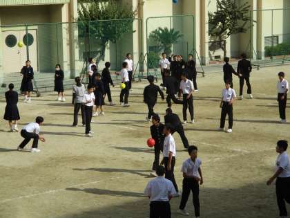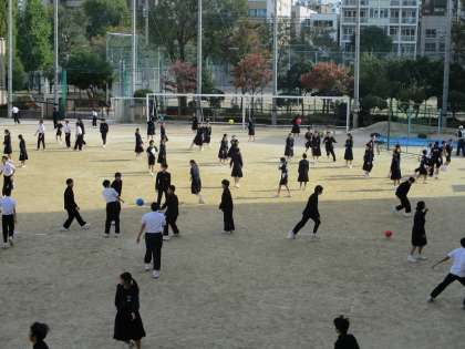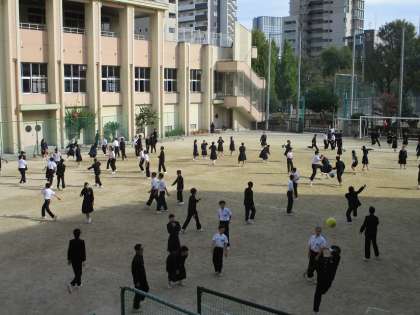 11月7日(木)お昼休みのグラウンドでは、今日も多くの生徒が、ボールを借りて、バレーボールやドッジボールで運動しています。体育の授業でバレーボールをしているので、トス回しの生徒が増えてきました。道路をはさんで南側の公園グラウンドでは、3年生がサッカーをしています。天気の良い日は多くの生徒が外で活動しています。