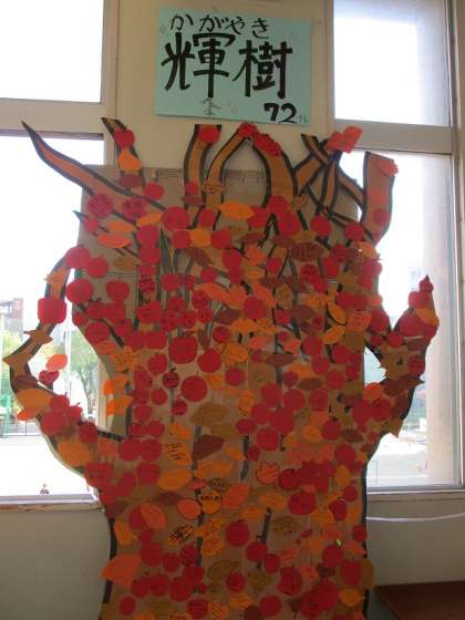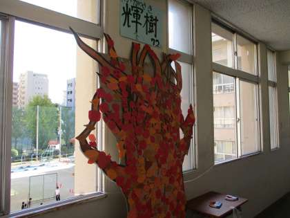 11月7日(木)より、3階廊下中央に大きな「輝樹(かがやき)」が出現しました。葉っぱには、来週15日の校外学習に対する想い。リンゴには、来月6日の球技大会に対する前向きな気持ちが、それぞれ書かれています。秋も深まりつつあります。これは72期生2学年の取り組みです。