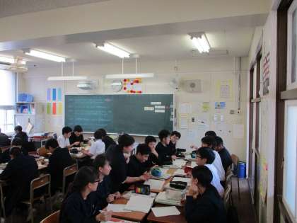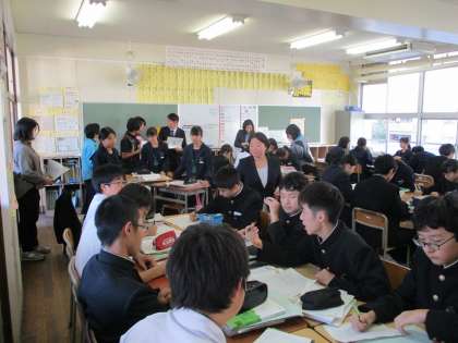 11月1日(金)から8日(金)までの一週間は、2年生の公開授業週間でした。2年生所属の先生方が、「言語活動をどのように取り入れるか」をテーマに教科指導案を作成し、授業を行いました。写真は11月8日(金)6限目、国語「走れメロス」の登場人物を班で相談して「人物相関図」を作成し、それぞれの課題を導き出している授業です。