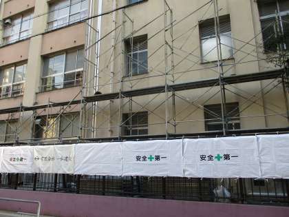 11月13日(水)の足場組立作業の進行状況です。西館もグラウンド側の作業が始まりました。本館北側の足場組立作業も始まっています。写真では分かりませんが、西館屋上の防水工事も同時に行っています。