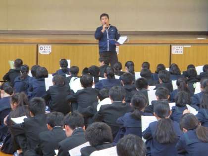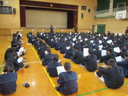11月14日(木)6限目、体育館で1年生校外学習事前指導(写真)を行いました。学年主任が「しおり」を使って説明しました。その後、生活指導部長より「人の嫌がることを言ったり、書いたりしない。」ように、マナーやルールについて話をしました。
