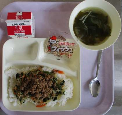 今日の給食の「ビビンバ」で使われている「ほうれん草」は、冬の寒い時期は甘みが増します。また、ビタミンC量は夏季の成分値が低いことが知られており、冬場のものは夏場の約3倍となっています。