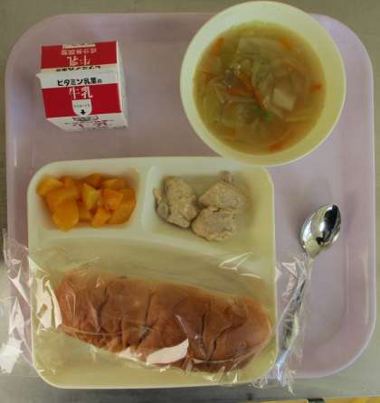 今日の給食の「黄桃(カット缶)」は山形県産の「黄もも」を使用し、食べやすいように一口サイズにカットしてあります。