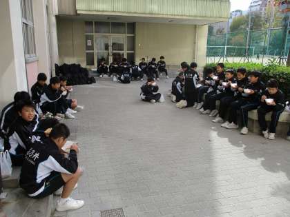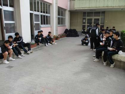 防災訓練では、男子バスケットボールの生徒たちが、練習前に体育館内の会場設営。また練習後には、体育館の後片付け。そして最後に、避難物資の水などを、部室棟1階から体育館3階の防災倉庫に運びました。地域の方々と同様に、炊き出し訓練で調理された「豚汁・アルファ化米」を試食しました。