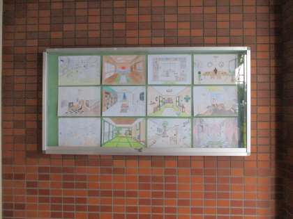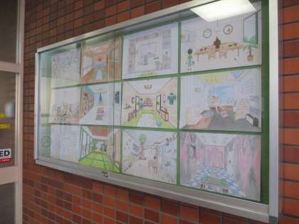 12月13日(金)玄関の掲示板に、3年進路懇談会に合わせて、3年美術科の授業で制作した作品(理想の部屋「テーマルーム」)を展示しました。