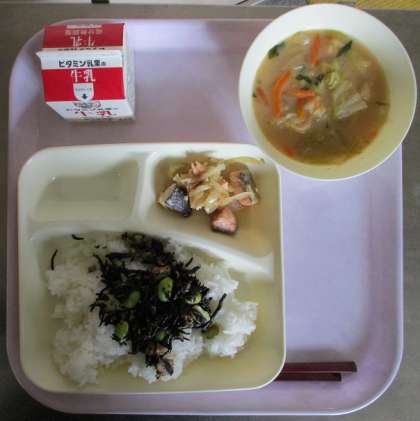 今日の給食は「学校給食献立コンクール最優秀賞作品」です。平野区、瓜破西小学校の昨年の小学6年生の作品です。献立のねらいは「色どりを意識して、見た目も味も食感も楽しんでもらう健康メニュー」になっています。