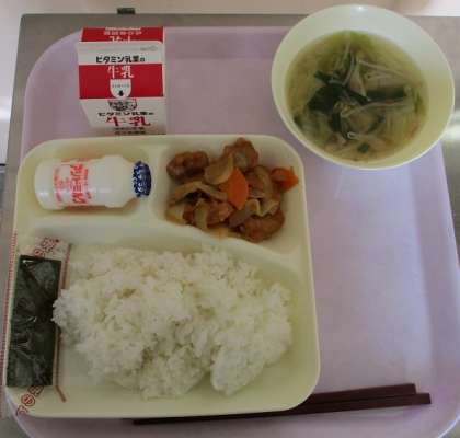 ご飯、牛乳、酢豚、中華スープ、焼きのり、発酵乳