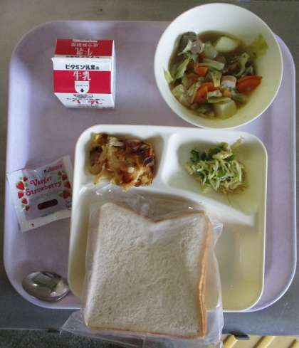 今日の給食「ポトフ(pot au feu)」 は、フランスの家庭料理のひとつで、肉や野菜、香草を煮こんだスープのことをと言います。煮こんだ肉と野菜をスープと一緒に食べます。給食では牛肉とウインナー、じゃがいも、キャベツ、にんじん、パセリを使っています。