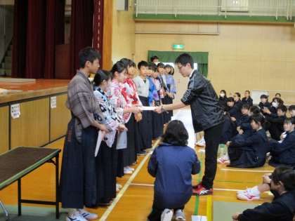 開会宣言、ツール説明の後、百人一首J1を見事に勝ち抜いた、百人一首の各クラス「名人」が表彰されました。