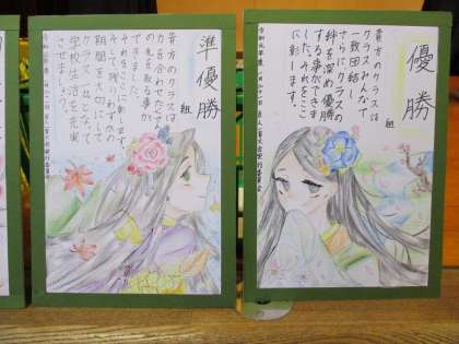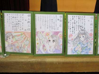 「名人」の表彰後、百人一首大会実行員作成の手作りの表彰状が紹介されました。この表彰状をかけて、クラスの団体戦(優勝・準優勝)、個人戦(一位・二位・三位)、名人戦(クィーン・キング)で競い合うことになります。