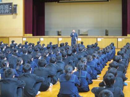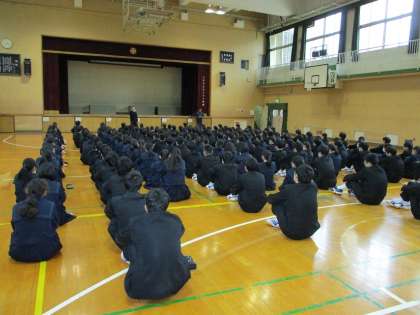 1月23日(木)6限目、3年生は体育館で、私立高校出願事前指導を行いました。学年主任より、明日24日(金)の午後からの出願に向けて、全体説明しました。大きく分けて、出願前(学校にて)、出願時の注意事項、学校に帰校後の3つです。